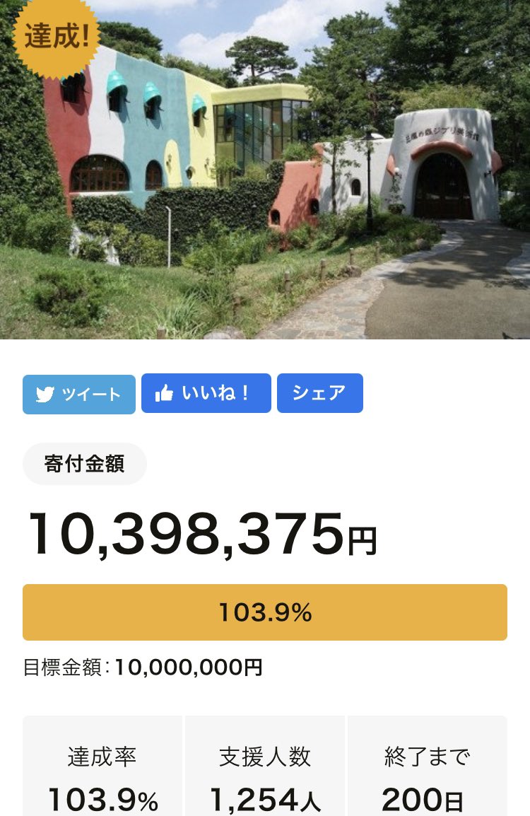 開始から1日、終了まで200日を残して目標の1,000万円達成!みんなどんだけジブリ好きなんだ!笑